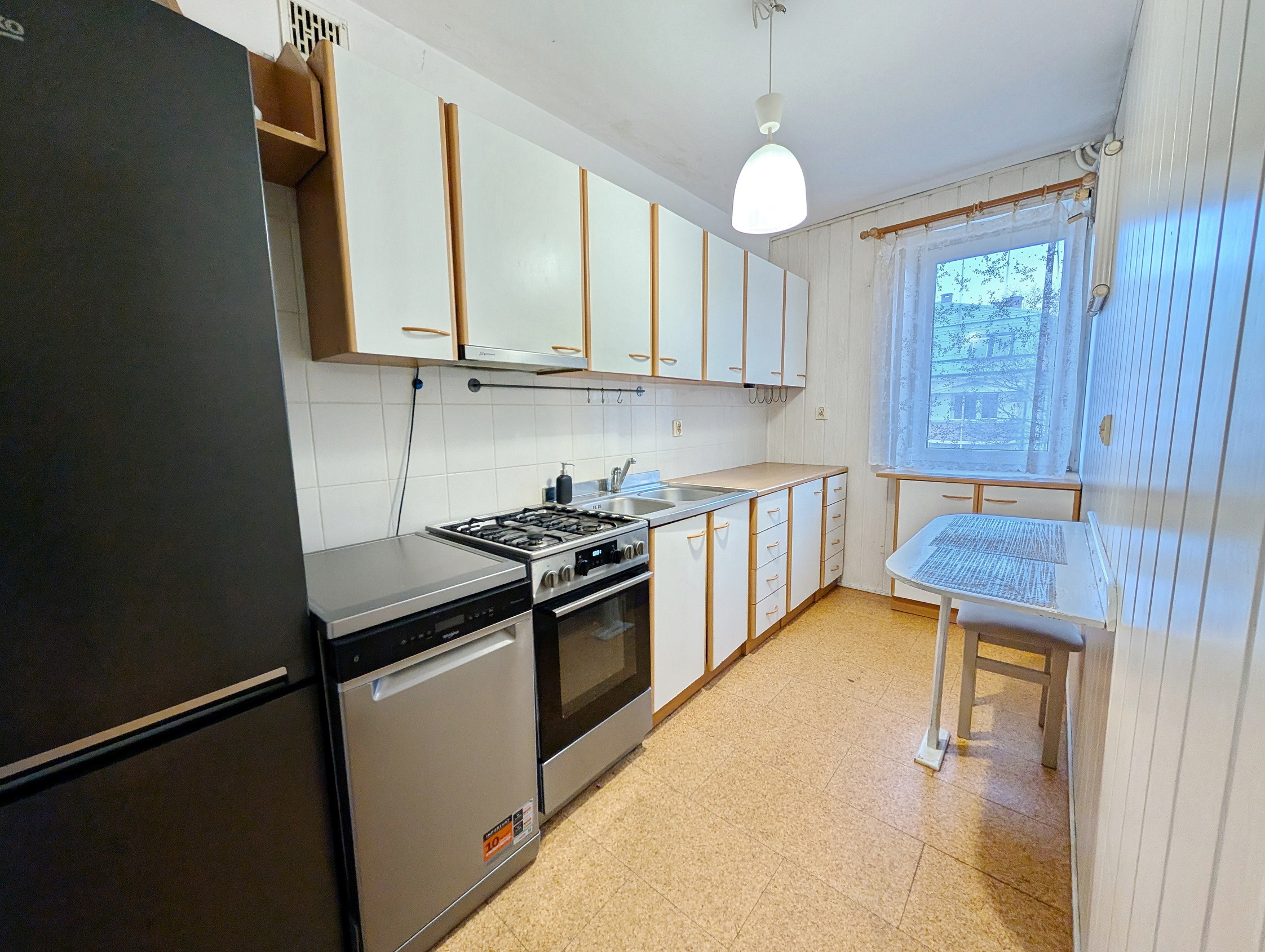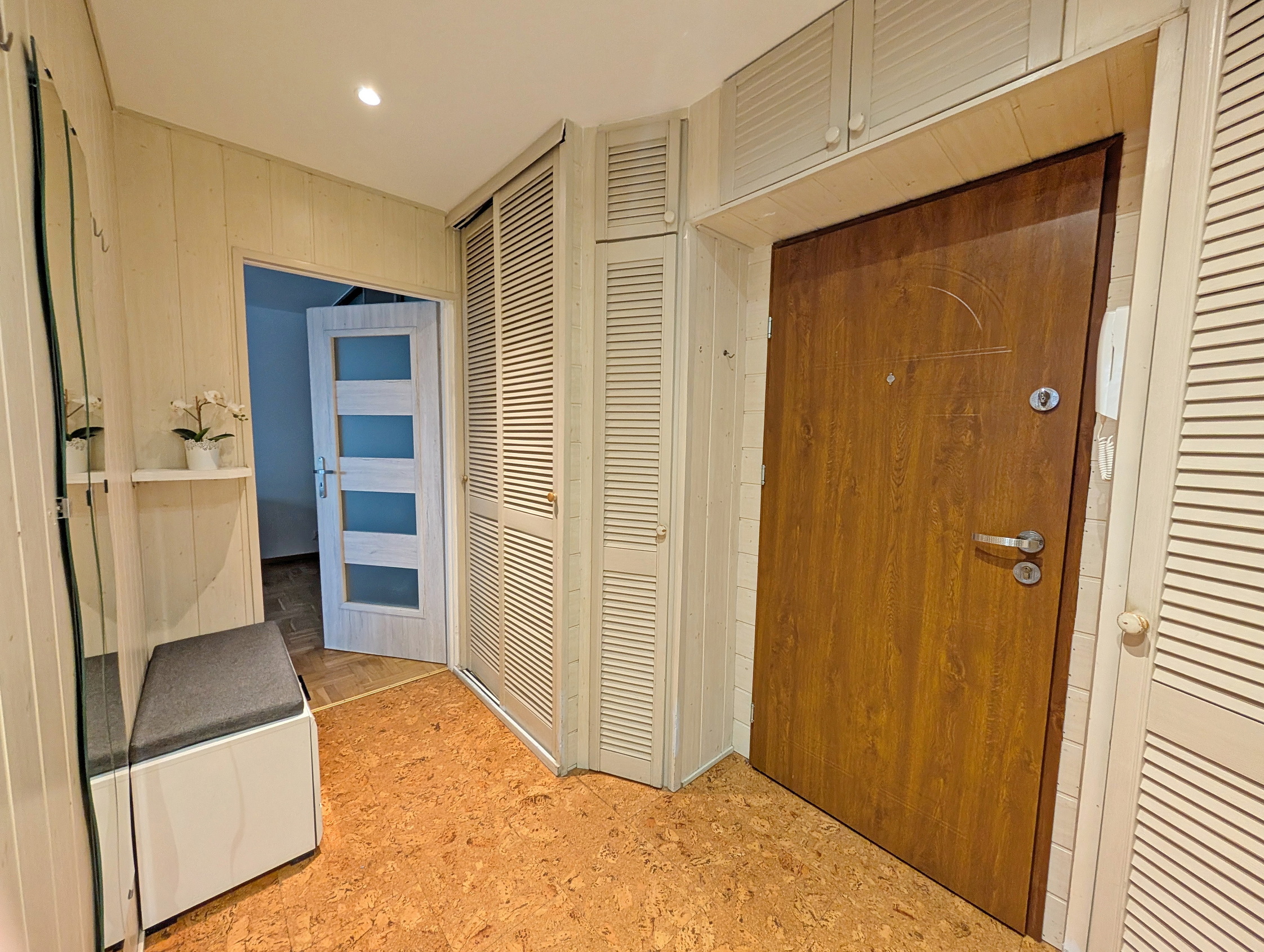 Na podłodze w przedpokoju i kuchni korek, w pokojach drewniany parkiet.